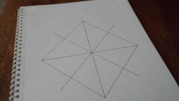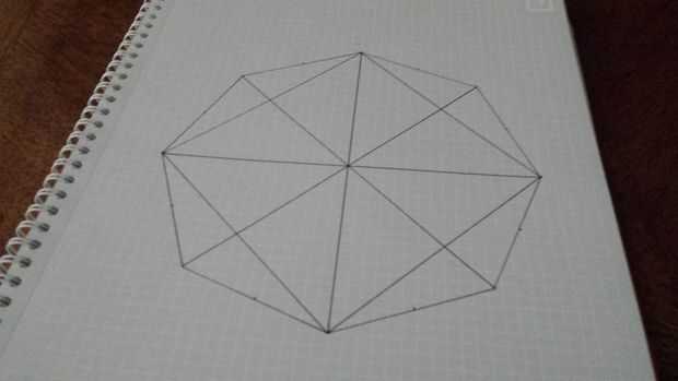 En las líneas de perímetro de cuatro que acaba de trazar, marcar su punto medio. Ahora, dibujar nuevas líneas de longitud radio del centro y pasando por el punto medio de las líneas de perímetro. Conecte los puntos finales de las nuevas líneas a los puntos de radio más cercanos. Esto crea ocho triángulos isósceles nuevo. (es decir. deben hacer ocho nuevas líneas de perímetro para este paso.)