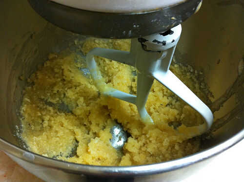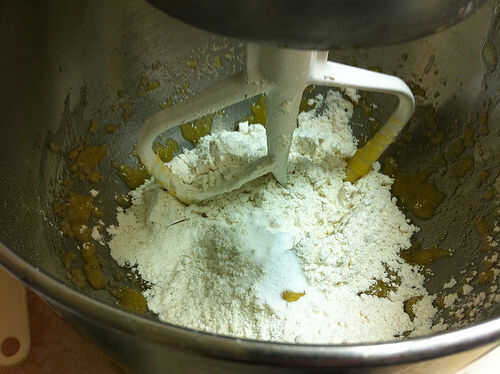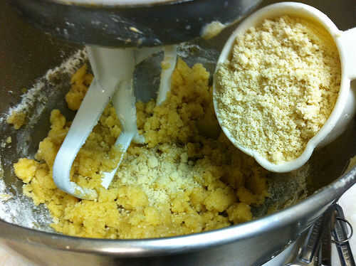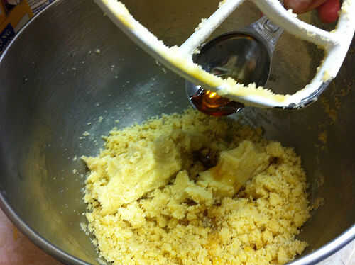 Añadir la harina junto con la comida de bicarbonato de sodio, sal y almendras. Mezclar bien. La masa estará muy quebradiza. Añadir la vainilla y el jarabe de arce y mezclar otra vez. Debe ser capaz de apretar una pelota de masa con la mano, aunque sea desmenuzable.