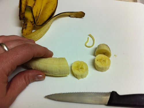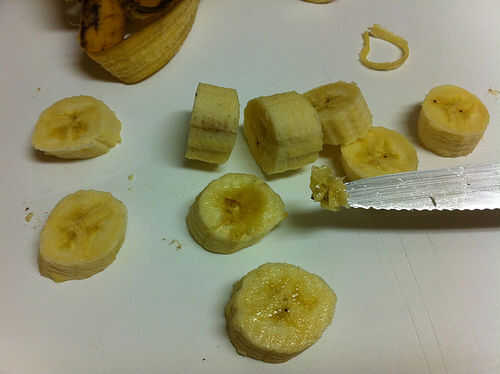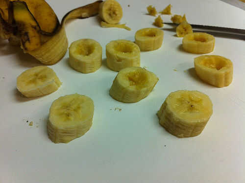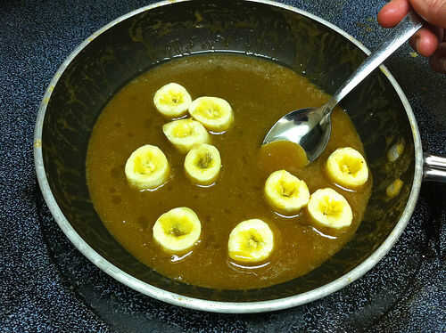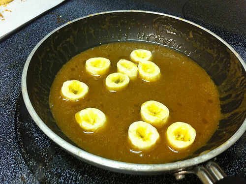 Cortar en rodajas el plátano. Si vas a usar fuego, utilice un cuchillo pequeño para cortar un pequeño hueco en cada rodaja de plátano. Si no vas a los de la antorcha, simplemente deje las rebanadas de llano. Coloque las rebanadas en la sartén (caliente) de caramelo. Asegúrese de que son los lados hueco. Deje que el pan se enfríe durante unos minutos; el calor cocina suavemente los fondos de las rodajas de plátano; Esto suaviza el sabor y textura, haciéndolos un poco más suave y afrutado. No darles la vuelta.