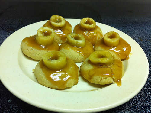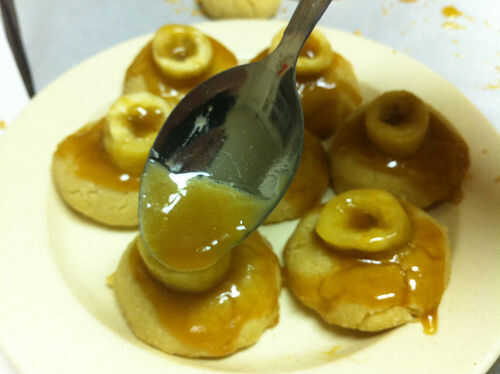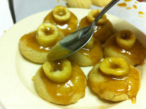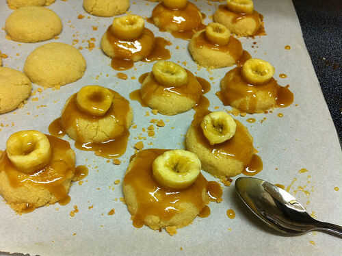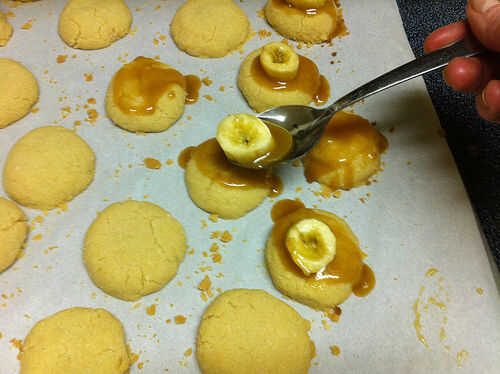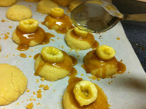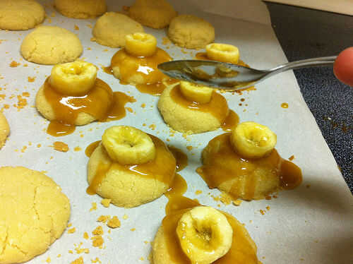 Una vez que las galletas son cubiertas con caramelo, sacar las rodajas de banana y el lugar uno en cada galleta. Gotear un poco caramelo en el hueco de cada rodaja de plátano, asegurándose de no llenarlos totalmente.