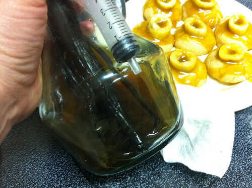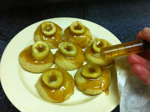 Llené una jeringa pequeña para hacer esto más fácil, puesto que las rebanadas de plátano son pequeñas. Terminé usando menos de 1/2 mL de alcohol para cada cookie... apenas unas gotas.