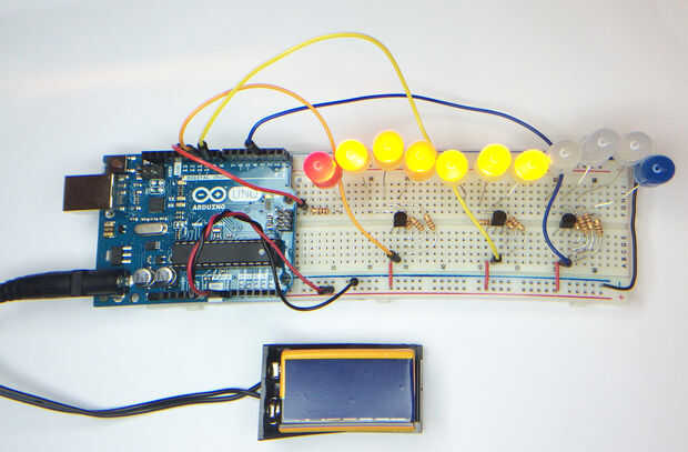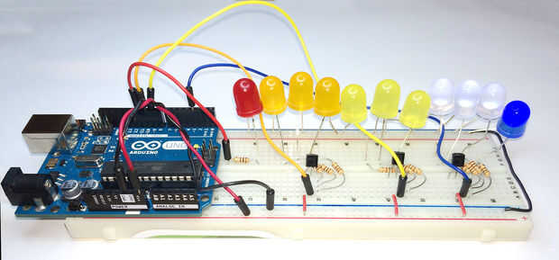 Ahora que tienes la sección de blanco y azul con cable, siga adelante y repita los mismos pasos para los LEDs naranja y amarillo. El perno de centro de los FETs en estas secciones debe conectar con un cable de Carlitos puente a los pines "~ 9" y "~ 10" respectivamente en el Arduino. He usado amarillo y naranja los cables porque tenía disponibles.