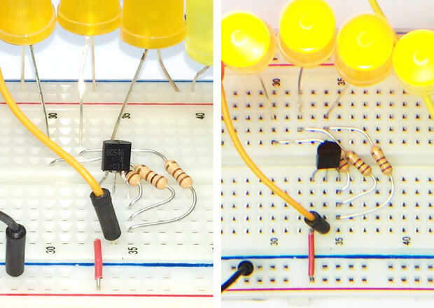 El lado positivo del LED (llamado el "ánodo") debe insertar en el protoboard, pero la colocación no es necesario ser demasiado específicos como está cerca de la FET y en la mitad superior de la placa. Ahora tome un resistor de 100Ω y enchufe un extremo en la misma columna como uno de piernas positivo de los LED. Ver cerca imágenes si es necesario. La resistencia debe conectarse en la misma columna como el lado positivo del LED y en la mitad superior de la placa. Ahora Conecte el otro extremo de la resistencia de la misma columna como el perno derecho de FET. En mis fotos esto es columna 57. Nota: resistencias no tienen polaridad, por lo que funcionan de la misma en ambas direcciones.