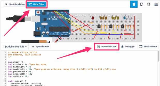 - Abrir el código (se adjunta), o conseguirlo haciendo clic en "Editor de código" en la simulación (del paso 1)