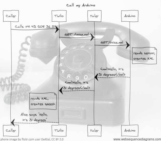 Twilio es un servicio Web que convierte todo en un teléfono. Es una API REST para telefonía, alojado en la nube. En este caso, Twilio pide el Arduino un nuevo archivo voice.xml cada vez que alguien llama número predefinido de Arduino. El contenido de la respuesta es leído a la persona que llama por Alice, una voz del motor de texto a voz de Twilio.