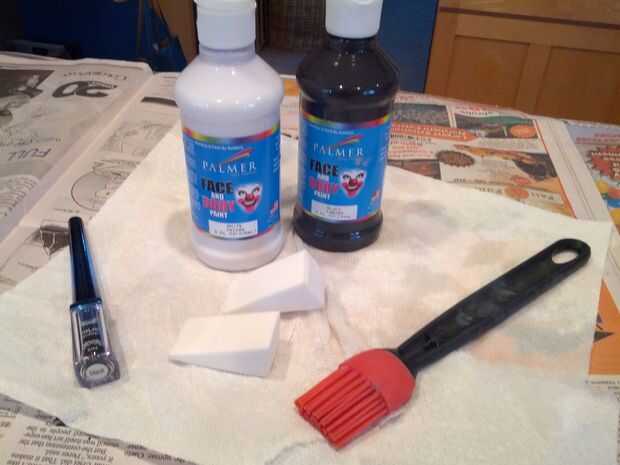 Pintura Palmer en blanco y negro en línea y con una brocha de cocina y esponjas de maquillaje. El pincel de repostería fue grande para pintar el pelo. Recomendamos.