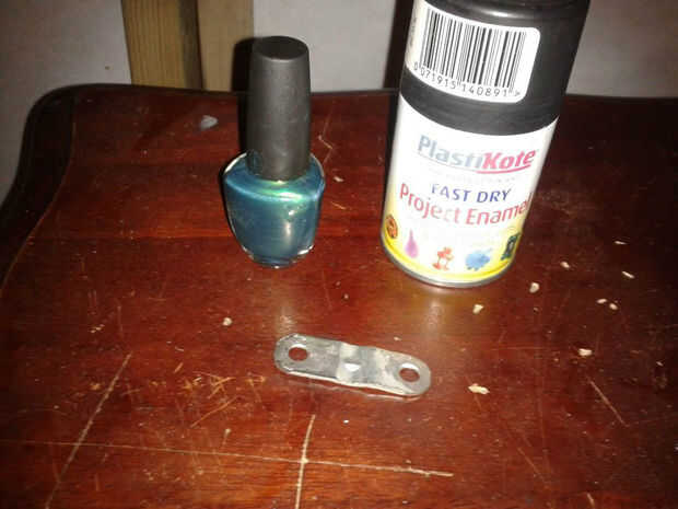 Después de moler (o no) puede ahora pintura, textura o angustia la rodillera. He hecho varios de estos collares con diferentes técnicas. Si usted no está interesado en gastar mucho en pintura o cosas así puede tratar de barniz de uñas. Unos barnices de uñas son realmente agradables y la gran variedad de colores, texturas y aplicaciones. Los metálicos funcionan mejor en mi opinión, pero cuando hice uno para mi novia, decidí ir con un color de rosa de neón brillante. Brillo y barnices de mármol son también por ahí pero no podíamos realmente encontrar ninguna así que hice lo.