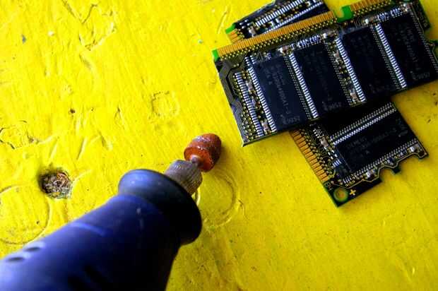 Permítanme recordarles, polvo de PCB es desagradable, así que usar una máscara. Cuando esmerile, se producir el polvo de la mayoría, así que asegúrese de que no está respirando. Además, siempre usando una herramienta giratoria, utilice protección para los ojos. Puede encontrar una resistencia suelta o algo del tipo mientras que están moliendo el RAM, que potencialmente podría convertirse en un proyectil volando a su ojo.