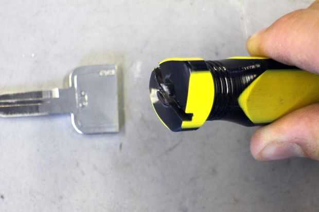 Con la llave de corte con un piso nuevo y después de asegurarse de que cabe fácilmente en la ranura de corte, la clave puede ser luego ajustaron en su lugar.