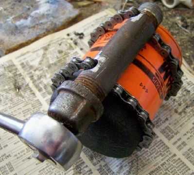 La cadena refuerza su control sobre el filtro de aceite como el tubo se retuerce cuando se aplica presión a la manija del trinquete.