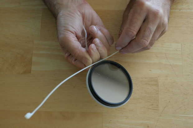 Mientras sujeta el filtro por el lazo de cable en una mano, envuelva el lazo de cable de segunda por el segundo filtro (o lente de la cámara).
