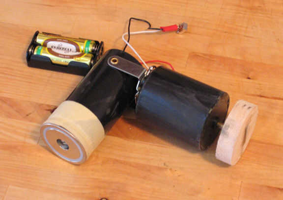 El motor de este proyecto es necesario para orientarse hacia abajo realmente lento, por lo que se vería como un resorte de reloj, no un ventilador, y una solución casi ideal era un spinner de bola de discoteca. El único problema es que no están diseñados para ejercer cualquier esfuerzo de torsión significativo, por lo que la clave debe ser lo más ligera posible. Para hacer el ajuste motor dentro del tubo del eje, corte las cubiertas de la caja de engranajes tornillo fichas y lo ajustaron cierre, teniendo cuidado de no goma de los engranajes. Luego descubrí que duplicando la tensión podría aumentar la potencia y la velocidad un poco, así que una célula 2 caja de la batería AA había cableado a un interruptor y soldadas en los contactos del motor. Para montar la caja de batería, tuve que tire hacia fuera de los contactos de resorte existente y volver a colocar los remaches (squish) la bisagra. El imán está conectado a través de una tuerca, el perno y la arandela a través de un orificio en la parte inferior de la cubeta de la batería.