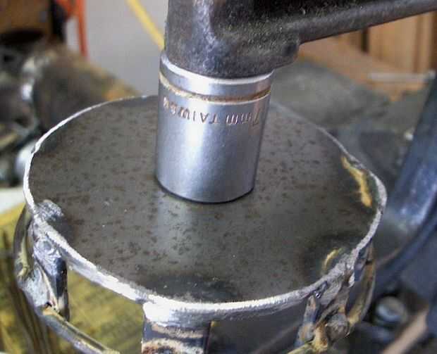 fui a una tienda de herramienta local que vende herramientas nuevas y usadas. Un zócalo de 17mm importación barato utilizado para 3/8 de pulgada coche fue un dólar. Centrado en la toma de la parte inferior de la llave del filtro de aceite y me sujeta en su lugar con una abrazadera de "C". Entonces soldó con autógena el zócalo para el disco de acero en la llave del filtro de aceite. Como se puede ver, utilicé una amoladora para quitar filos y darle un aspecto más agradable.