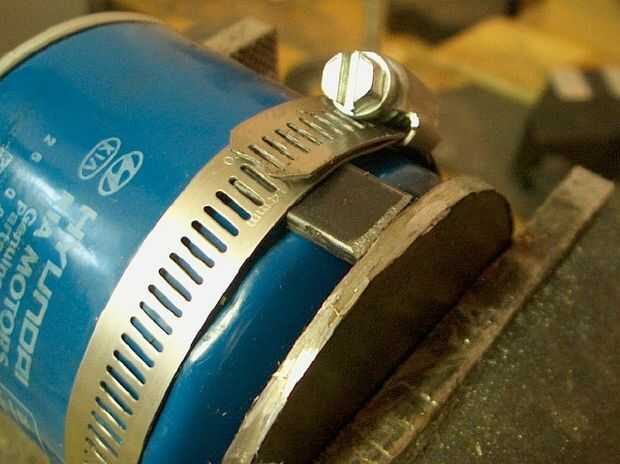 Deslizar la abrazadera ampliada alrededor del cuerpo de un filtro de aceite. Deslice una pestaña de acero debajo de la abrazadera de la manguera y en una de las flautas de filtro de aceite. Empuje la pestaña hacia abajo de forma que toque el disco de acero. Revise cuidadosamente para estar seguro de que el filtro se centra en el disco. Usé un tornillo de banco para soldadura. Soldar la ficha en el disco.
