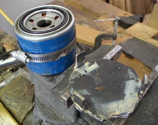 En este punto tres lengüetas de acero han sido soldadas en el disco. El primer par de lengüetas es las más difíciles de colocar y soldar. Más cosas pueden salir mal en ese momento. Antes de soldar la ficha segundo, realizar los ajustes finos necesarios en la posición del filtro con respecto al disco de acero. La foto muestra el filtro de la disco y las pestañas. Posición de la manguera de la abrazadera por lo que mantiene las pestañas en su sitio para la soldadura, pero ten cuidado que no soldar accidentalmente la abrazadera de la manguera a una ficha.