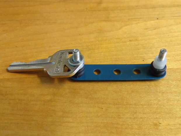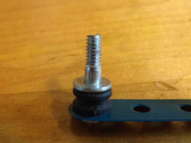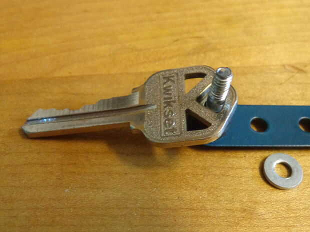 Para este paso, vas a necesitar las dos arandelas y su clave. Coloque una arandela en el tornillo de la izquierda. A continuación, poner la clave y la segunda arandela en la parte superior. Compruebe la última foto de este paso para asegurarse de que todo se apilan correctamente a partir de ahora.