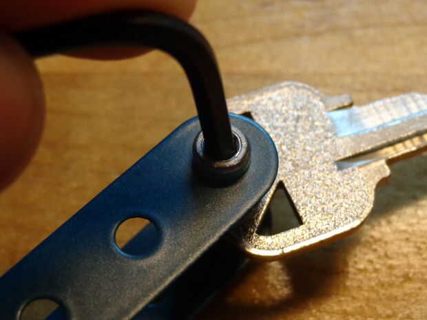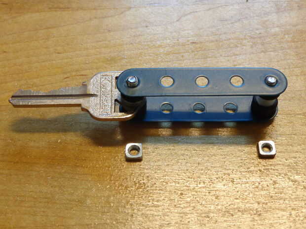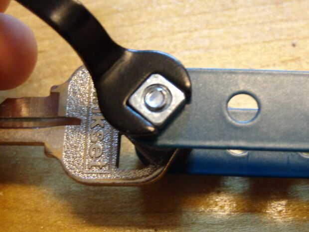 Ahora, tenemos que asegurar todas las piezas hacia abajo juntos. Para ello, necesitaremos dos de los cuatro cuadrados de frutos secos. Utilizando la llave Allen la llave normal, apretar la tuerca para que aún se pueden ver unos 2 milímetros del tornillo.