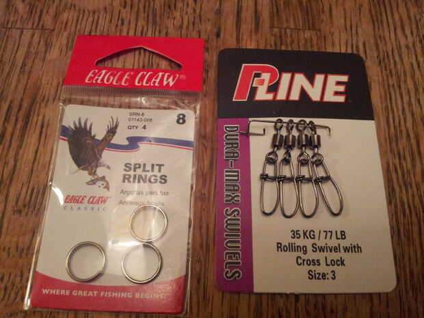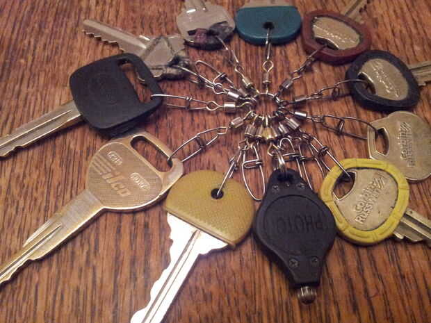 Todo lo necesario para probar esto por ti mismo es unos dólares para un viaje rápido a la sección de pesca de una tienda local de artículos deportivos. Recoger un paquete de anillos de split (tengo un paquete de 4 anillos de split #8, que son aproximadamente la mitad una pulgada a través de) y uno o más paquetes de emerillones snap (necesita un giro para cada tecla en su anillo, además de algunos extras por si acaso). Yo tamaño 3 'Cruz-lock' snap gira porque el cierre fue lo suficientemente grande como para acomodar cualquier tecla que me he topado, y la Cruz-cerradura giratoria no tiene extremos sobresaliendo a poke me. Solo he podido ver esta marca en Bimart, lucirá sus broches de presión y gira probablemente un poco diferente - sólo asegúrese de que la presión es suficientemente grande para contener su clave más gorda y el ojo de la gira es lo suficientemente grande como para caber alrededor de la llama de tu fractura. Vuelta el cierre gira en un anillo (hacerlas todas a la vez), luego carga las llaves en los broches! Hecho.
