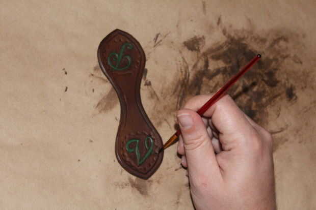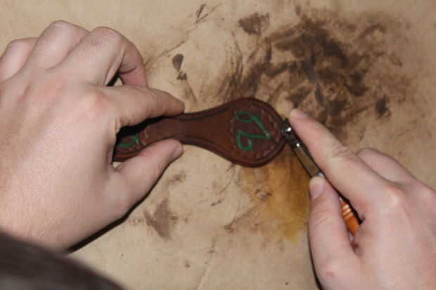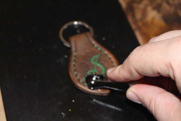 Primero, mojar la costura ranura con un pincel y agua. Tomar el volante de costura y asegúrese de que la rueda correspondiente está cargada en él. He utilizado una rueda 5 de SPI (puntadas por pulgada). En un proyecto pequeño puede utilizar una rueda más pequeña pero asegúrese de que no es demasiado pequeño para el hilo de rosca que se usará. Una vez marcados los puntos de sutura doble el proyecto es la mitad otra vez y fijarlo con la abrazadera utilizando una abrazadera de resorte. Asegúrese de proteger el proyecto algunos desechos de cuero entre el proyecto y la abrazadera en ambos lados. Esto es para mantener juntos para que no resbale mientras lo mueve. Podría seguir adelante e instale el anillo de clave y pegue en este momento pero hace mucho más difícil mantenerlo en la placa de empuje.