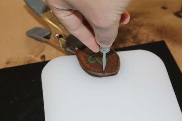 Ahora vamos a puntada de silla de montar todo el camino alrededor. Costura de silla de montar es bastante simple pero aquí es un gran detalle video explicándolo, 1 hr 30 min. En definitiva cerradura dos agujas a un subproceso que es aproximadamente 6 veces más largo que la longitud que cose, el múltiplo varía con el espesor de la piel pero el hilo es barato así que utilizan más de lo que piensas que necesitas estar seguro. En el segundo (o tercer) agujero, inserte una de las agujas y tire a través de til a la mitad del hilo. Empezar por la costura hacia atrás para el primer agujero, inserte la aguja de "frente" y tire a través de la mayoría de la manera, después inserte la aguja de "back" y tirar aunque procurando no perforar el hilo. Una vez en la primera puntada de agujero aunque de nuevo los mismos agujeros y continuar hasta el final. Comience siempre con el "frente" y luego "atrás" esta voluntad de ser la otra aguja cada vez cambiar lugares. Para hacer la puntada aseada también try y puso al frente de la aguja en la misma parte del agujero cada vez y la parte posterior también. Por ejemplo, el frente debe ir siempre en la parte inferior y parte más cercana del agujero y la parte posterior siempre debe ir en la parte superior y más lejos del orificio. Esta dará la puntada un aspecto uniforme y ayudar a reducir la posibilidad de que la aguja posterior penetra en el hilo. Al final, puntada atrás unos agujeros para fijar el hilo, sólo puntada atrás uno o dos agujero, lo que hiciste al principio para que se vea incluso. Puede que necesite utilizar un par de pinzas para ayudar a conseguir aunque la aguja al coser hacia atrás como el agujero será muy apretado. Asegúrese de que usted terminar con la "frente" aguja en la espalda, así. De esa manera todos los hilos sueltos están de un lado. Corte el hilo cerca del agujero para que no se pegue hacia fuera, pero hacer que no para golpear el cuero con el cuchillo o Marlo. Coger un mechero y calentar para arriba y toque a los extremos del hilo de rosca. Hilo encerado más moderno es de acrílico para esto derretirá el extremos y desentrañarlo debe reducir también así no es tan visible.