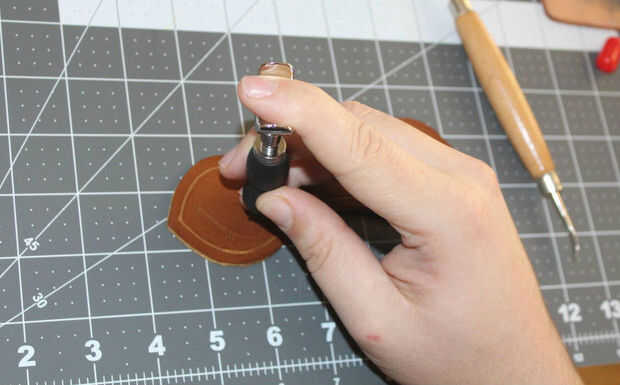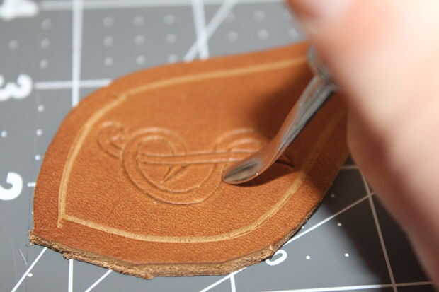 Una vez cortadas, todas las líneas exteriores de bisel. Cualquier cosa que no sea la letra real debe biselado hacia abajo por lo que la carta destaca del fondo. Puede utilizar una herramienta que bisela y el mazo pero es mucho más fácil y rápido usar la cuchara de modelado para empujar el bisel en el cuero. Sólo Deslice hacia abajo la línea con la curva hacia el exterior de la línea que desea biselar.