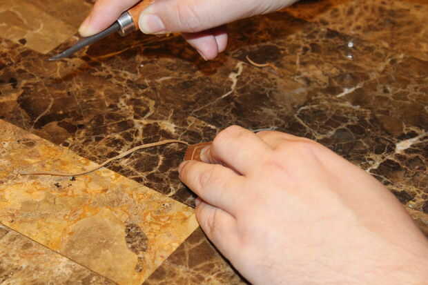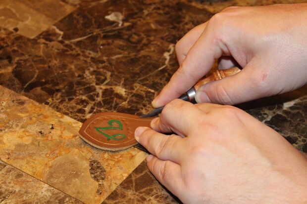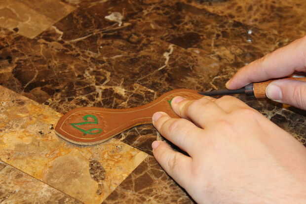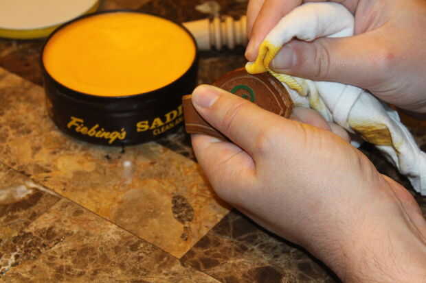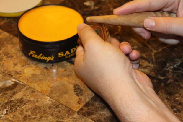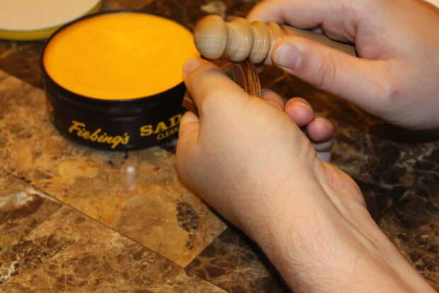 Pulido se utiliza para suavizar y endurecer el borde del cuero. Esto puede ser la parte más lenta y exigente de cualquier proyecto de cuero pero haciendo un buen trabajo aquí es lo que hace que un proyecto de aspecto profesional o aficionado. Hay muchos diferentes métodos de pulido pero realmente todo lo que necesitas es un agente slicking (agua, saliva, Goma tragacanto, glicerina, etc.) y la fricción (grasa del codo). Utilizo jabón de silla de montar de amarillo pastel y parece funcionar mejor que el agua sólo o spit y goma trag se reporta que no funciona lo suficientemente bien como para que mí haber comprado cualquiera. El jabón de la silla parece que funciona bastante bien y no bloquea tinte. Asegúrese de usar la forma de pasta y no el aerosol líquido ya que es de difícil control. Tomar algo de jabón para montar en un paño y frotar enérgicamente en el borde, asegúrese de que usted tiene un montón de jabón en el paño. También puede usar a una pulidora de madera que realmente puede ayudar a moldear el borde así como mancha el borde. El fob del doblez por la mitad y alinee los bordes como serán cuando cose. Utilice el área de los pulidores que se ajusta el espesor de las dos capas de cuero. También puede utilizar la parte recta de la pulidora en el borde mismo molde las dos piezas juntas y obtener un borde un poco más recto. El borde empieza a oscurecer y haz brillante. Este no es el bruñido final así que no te preocupes si los bordes no son todavía perfectos. Preste especial atención al área dobla aunque ya una vez que haya instalado el aro que será muy difícil llegar a pulir.