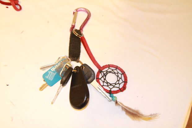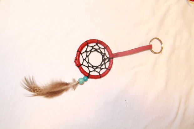 Se trata de un atrapasueños que estoy haciendo un juego de para mi amigo. Es un llavero envuelto en cuero negro con hilo azul y granos verde azulado que se encuentran fácilmente en su local del arte o super tienda (recomiendo Wal-mart para el cordón