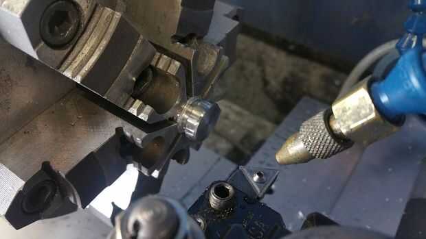Después de presionar algunos de la CNC, noté que el escoplo dejó un poco en el extremo posterior. Esto se puede subsanar haciendo otra operación despedida a más baja rpm, pero a veces el torno manual es lo mejor para montajes sucios rápidos. Lo arrojó las balas de la tirada e hicimos una luz frente a paso para obtener un acabado liso en la parte posterior.