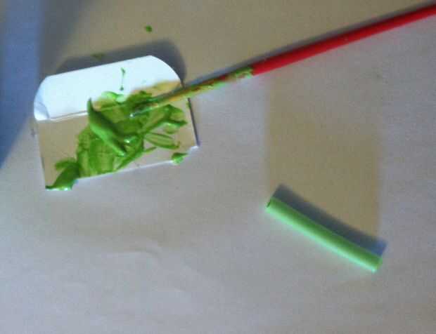Mantiene la punta de la botella de pintura firmemente contra el extremo del tubo, luego aprieta la pintura a través del tubo hasta que casi salió de la parte inferior. Luego coloca la pintura de abajo en mi escritorio y quitó la tapa, consiguió una paja, poner la paja hasta el final del tubo y sopló la pintura del tubo hacia atrás dentro de la botella de la pintura. Luego usé un q-Tip para limpiar los extremos del tubo para que el pegamento podría pegarse a él y limpia el exterior con un tejido.