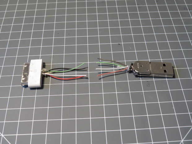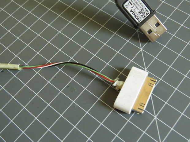 El primer paso para hacer el cargador es a distancia lo más posible de cada lado del cable. Mi cable de 30 pines tenía un sucio hasta el enchufe del USB, así que el USB de un cable de Nokia viejo.