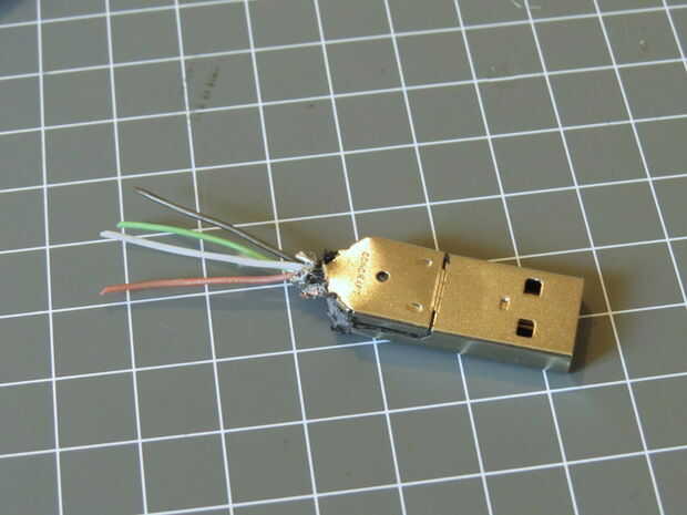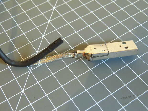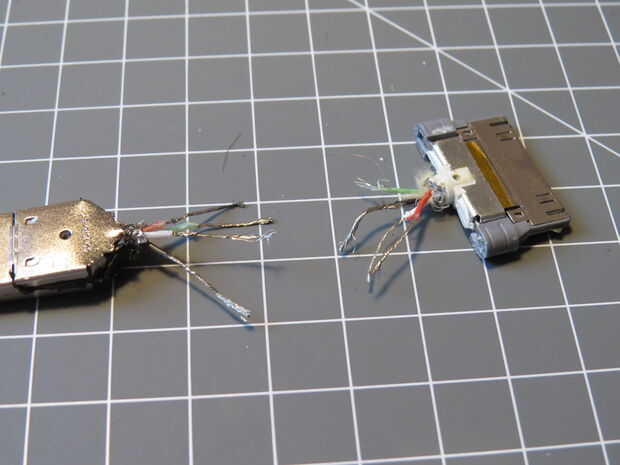 Una vez que tienes las cubiertas y quita el tubo de goma se dará cuenta de que los cables se envuelven en una apretada malla de metal. Tira lo lejos demasiado. Usted debe terminar con un enchufe pelado como se muestra arriba (no tomo una foto del cable desnudo de 30 pines, pero es el mismo trato).