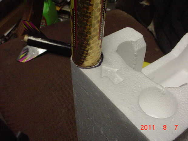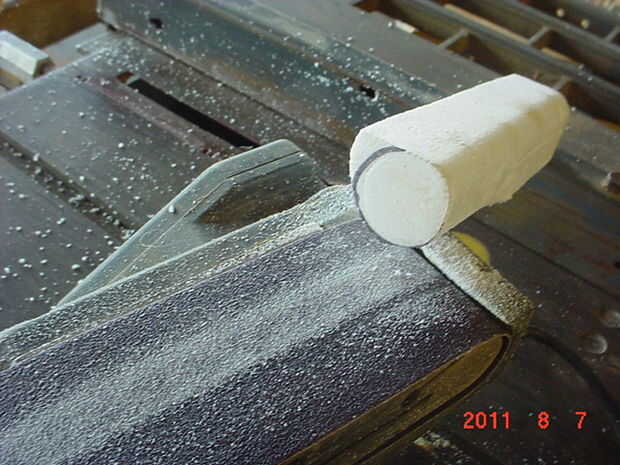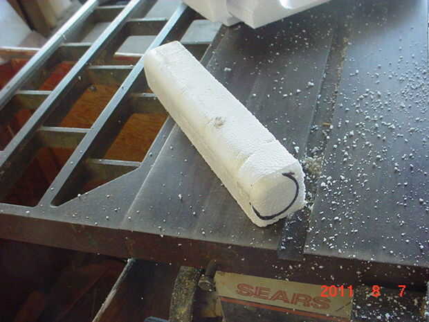 elegí stryofoam blanco ya que tengo mucha y que es luz y EZ a la arena y si no goof, ninguna gran pérdida excepto por algún tiempo, dibujaba un círculo en cada extremo, utiliza una sierra tbale para cortar un trozo cuadrado largo más grande que lo que necesito, usted puede siempre sacar, pero muy difícil de agregar. Luego usé un cinturón lijadora dejando al final que de la dirección del recorrido de la correa, si tratas de una manera diferente que come el stryofoam y éter romperlo o dedos de arena. El objetivo es hacer una larga ronda strofoam registro, terminado otra vez sólo un poco más grande que lo necesario.