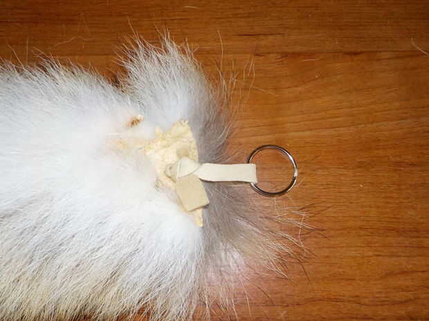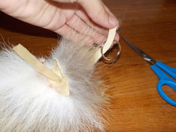 Después de que han empujado el cordón por el agujero, deslice el anillo de claves y ate el cordón en un fuerte nudo en la parte posterior de la cola. Esto completa el proceso accesorio de llavero.