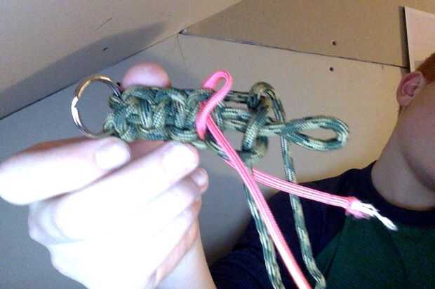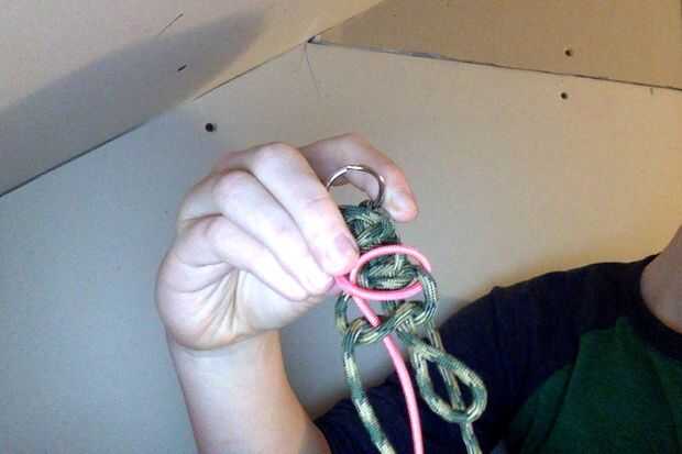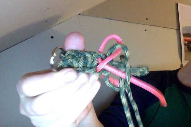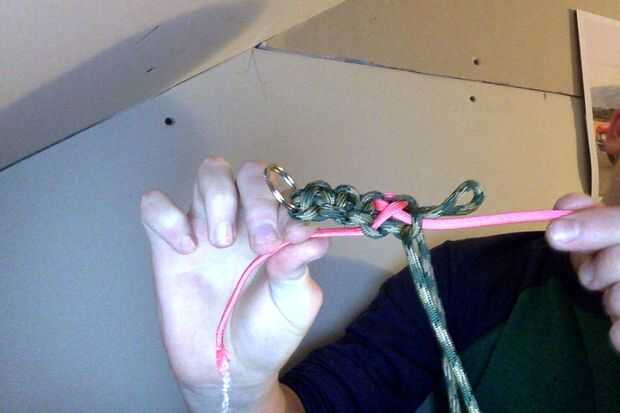 otra vez batallando para describirlo para que sea más fácil para usted seguir las imágenes. Tan primer empate la primera parte del pero no tensar tejido en color rosa o cinta por lo que parece una cinta. Luego ata la otra mitad del nudo por debajo de la cinta. Nuevo nudo medio pero el cable a través de la otra mitad de la cinta de la armadura.