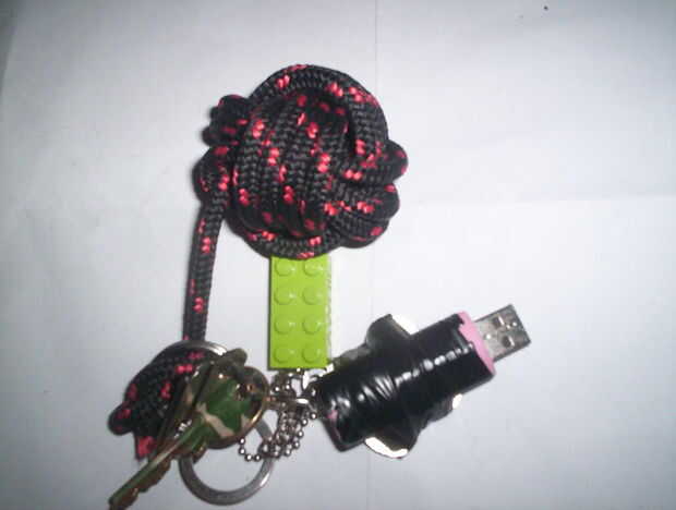 al final de este llavero fue hecho por la instrucción de "Kevin Gagne". Aquí usted puede encontrar su YouTube video:Paracordist cómo atar el nudo del lazo en un paracord monos puño llavero fob