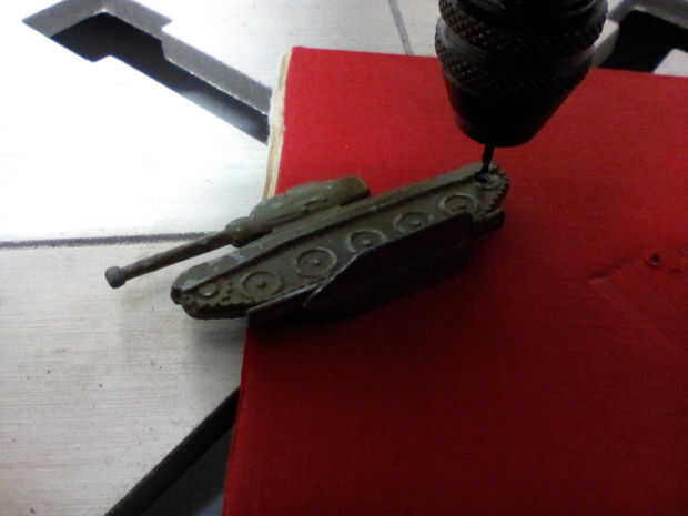 En primer lugar, necesita perforar el desplazador de juego. Utilice una broca muy pequeña, pero asegurarse de que todavía puede Enrosque el anillo de yjump del llavero encontrar a través del agujero, ya que son resistentes y pueden ser un poco grande. Usé una broca de 1.4mm y una dremel en un soporte de taladro para máximo control. Tenga cuidado si usted está usando un motor de juego plástico, como el taladro podría derretir el plástico muy rápidamente. Dependiendo el juego mover, puede perforar un agujero y después fijar un ojal en el agujero - si usted hace esto, usted necesitará utilizar una broca del mismo tamaño como el tornillo de ojal.
