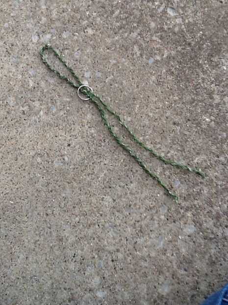 Doble la cuerda por la mitad y colocarlo con el llavero. Entonces haga un nudo en ambos lados de la cuerda donde toca el aro. Lugar de un lado a través del bucle de la parte inferior entonces Envuelva la cuerda de alrededor de él y ponerlo a través del orificio que hiciste con la primera mitad. Repita esto hasta que tenga alrededor de 1 de la izquierda de lazo.
