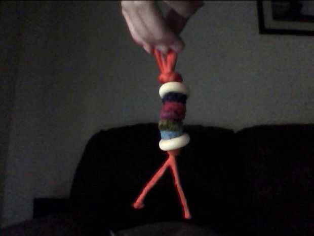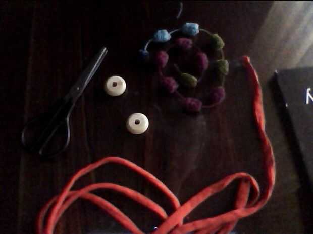 este abalorio recuerdo toma menos de 5 minutos para hacer y es tan simple, se preguntarán por qué nadie pensó de él cuanto antes! materiales: ~ lana de tejer de POM-POM ~ bobina de tela o tejido de cuerda de lavado ~ tijeras ~ granos de madera 2