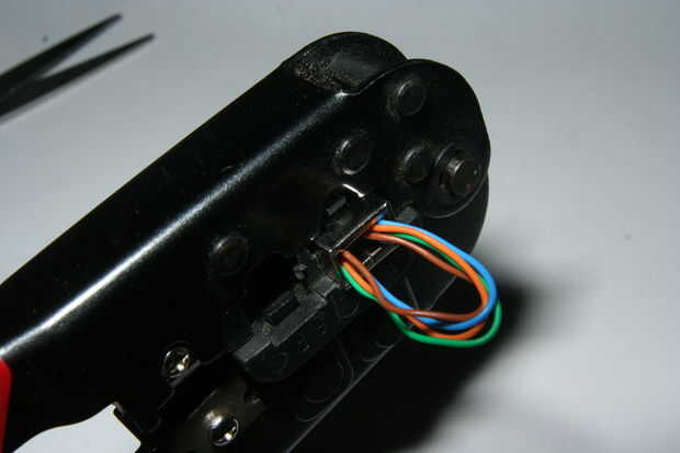 mientras mantiene los cables y asegurarse que lleguen al final de la encrespadura de enchufe el conector con la crimpadora.