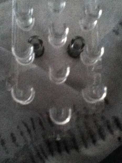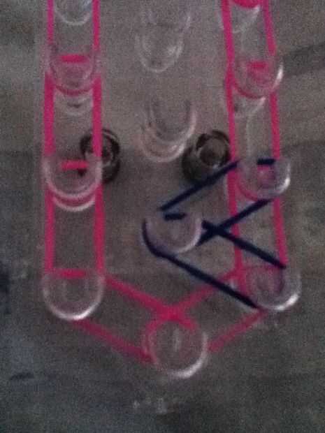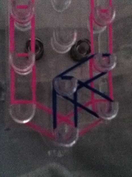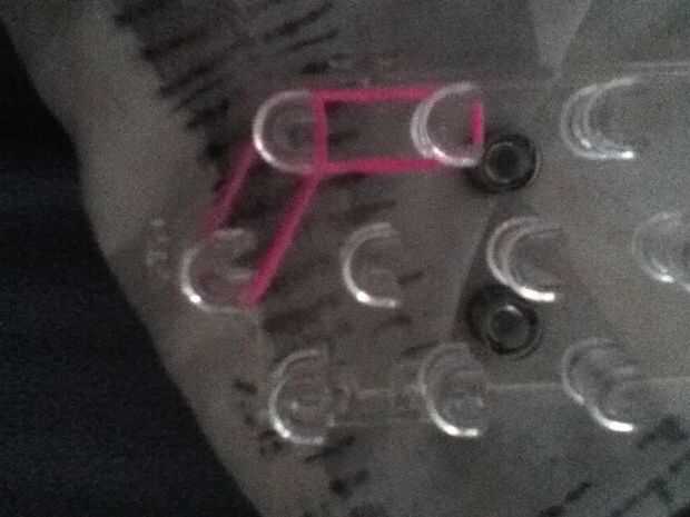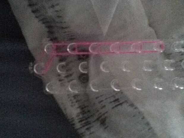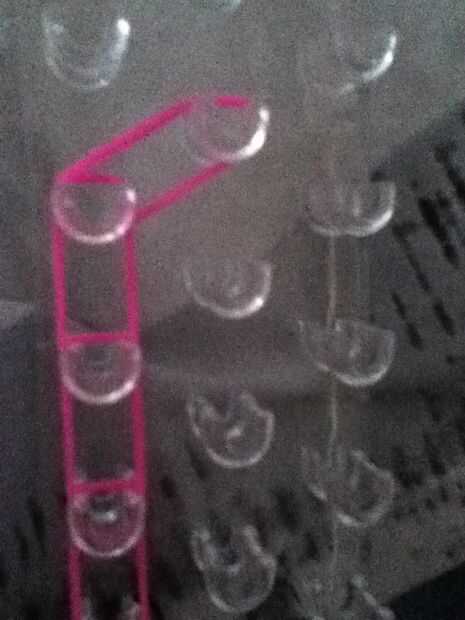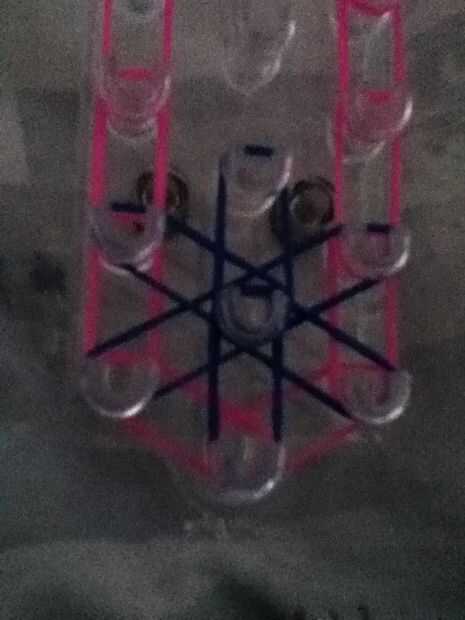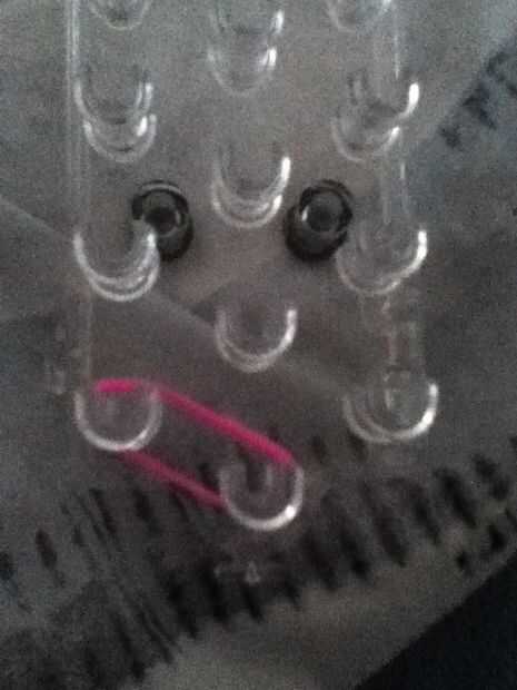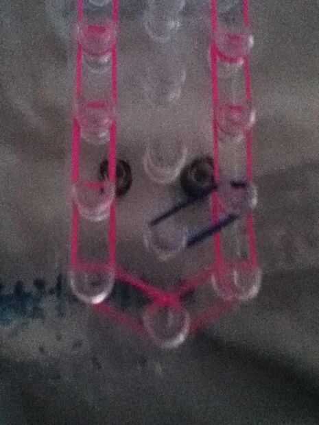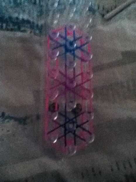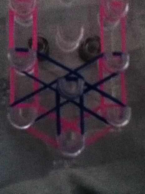 Ahora para las estrellas. Coloque la siguiente banda de color en el segundo pasador del lado izquierdo y el pasador central, siguiente banda el primer pin de lado izquierdo y pasador central, siguiente banda el pin donde comenzamos la patilla central, ahora el primer pin de lado derecho y la patilla central y el segundo pasador de lado derecho y el centro y finalmente el pin directamente encima de la patilla central y la patilla central. Repita este paso hasta llegar al final de las primeras bandas que colocaste.