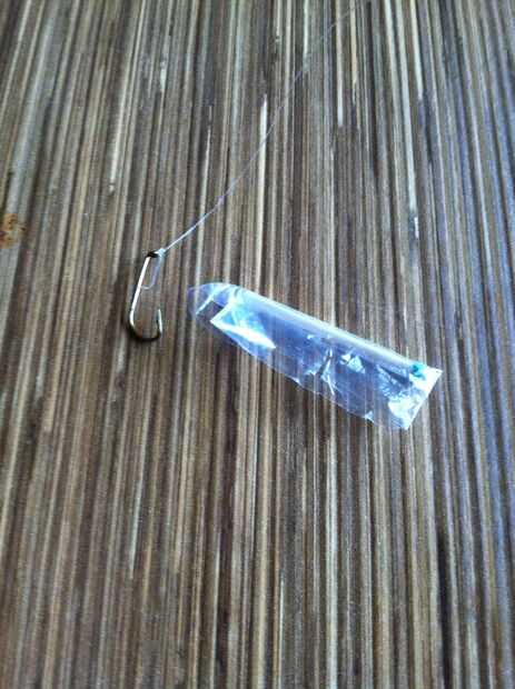 Comenzar cortando la esquina de la bolsa de ziplock para que el partido quede dentro y puede ser envuelto. Esto ayudará a mantener al partido seco. Atar el sedal en el gancho de la pesca.