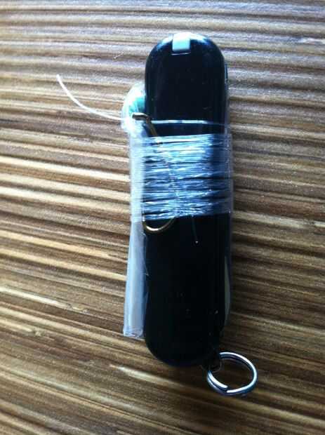 Lugar el partido envuelto en el plástico y el gancho en el cuchillo y envuelva firmemente ambos al cuchillo con el sedal atado al gancho. El gancho actúa como un ancla. una vez envuelto oculte al final para que la línea no se deshizo. Yo había escondido al final de mi línea entre el partido y el cuchillo.