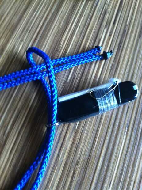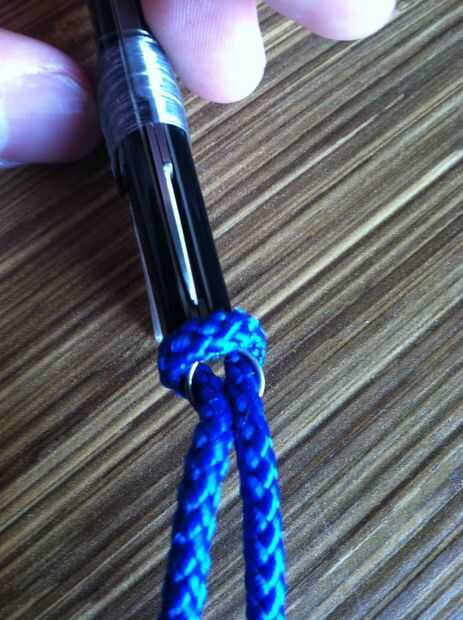 Encuentre el centro de la cuerda doblando por la mitad. tomar el centro e inserte a través el pequeño llavero en el cuchillo. Luego se alimentan los extremos sueltos por el lazo de la cuerda que acabamos de crear. Tire de los extremos sueltos hasta que el nudo está apretado.