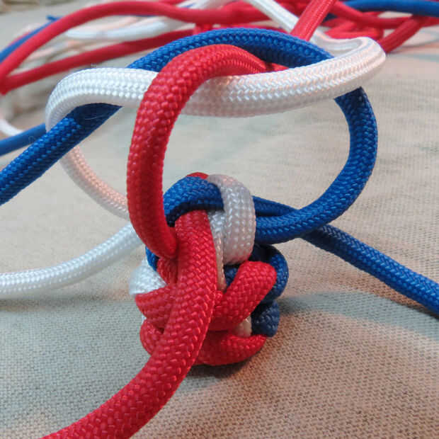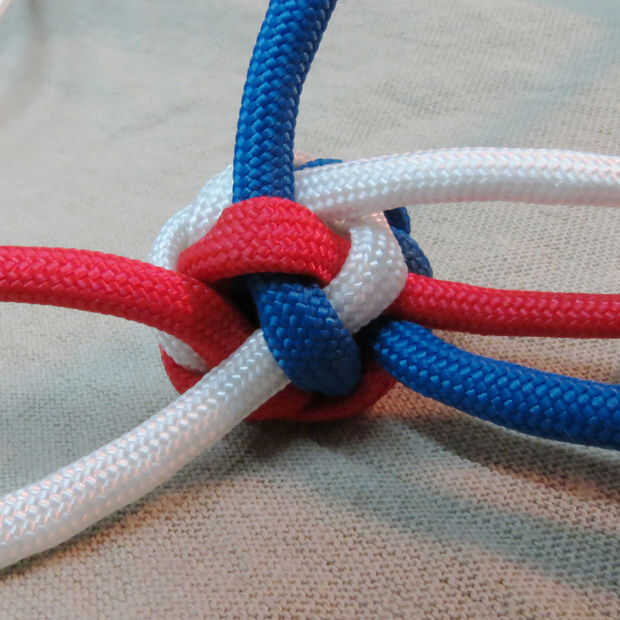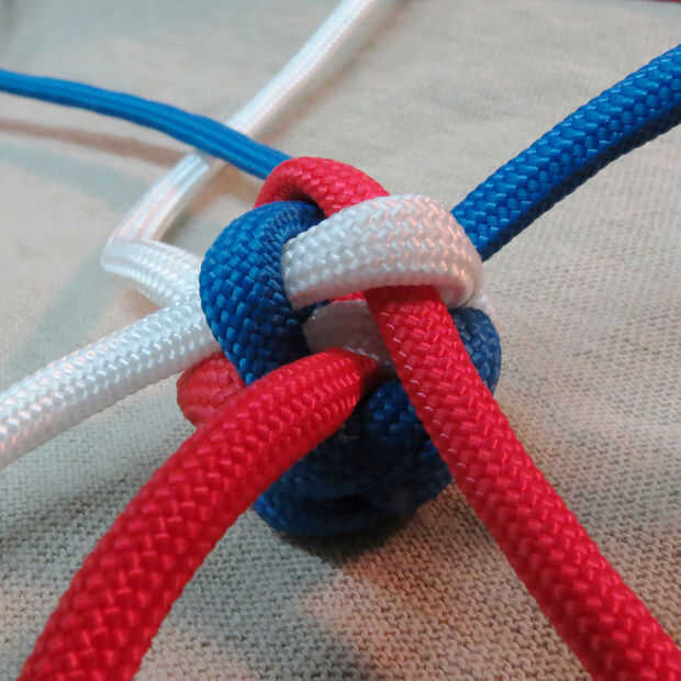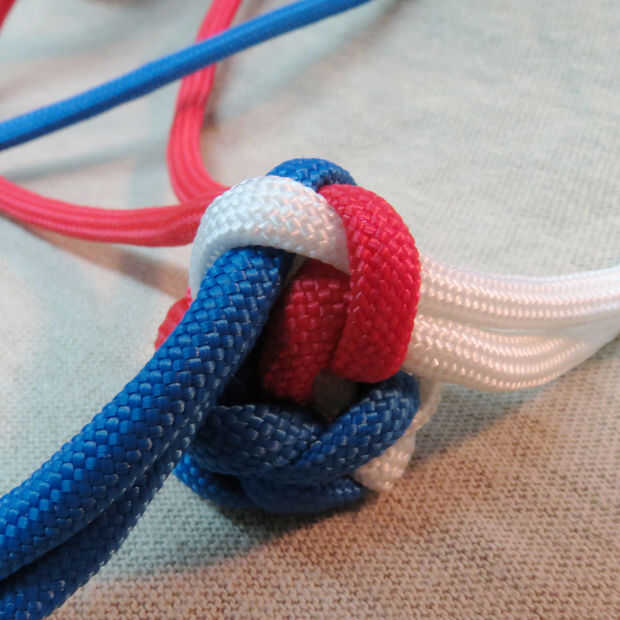 El primer triple debe ser tirado firmemente para que se sienta completamente dentro del nudo de la pared que creó anteriormente. He encontrado que con esta trenza particular, ayuda a volver atrás y aprieta la capa anterior y luego vuelva a apretar el nudo actual. Esto parece mantener el nudo más apretado, y presentar un aspecto más uniforme.