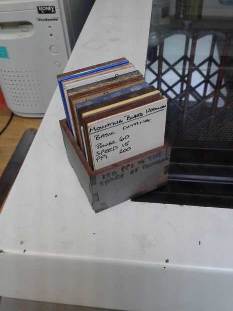 Para la 3 m m MDF corte - potencia 100, velocidad 4, PPI 200. (Las guías que vienen con el material dice mantener el PPI al mínimo al usar MDF).