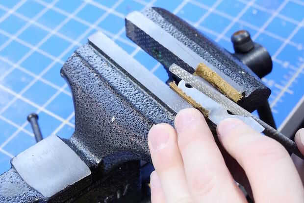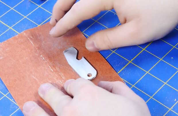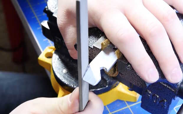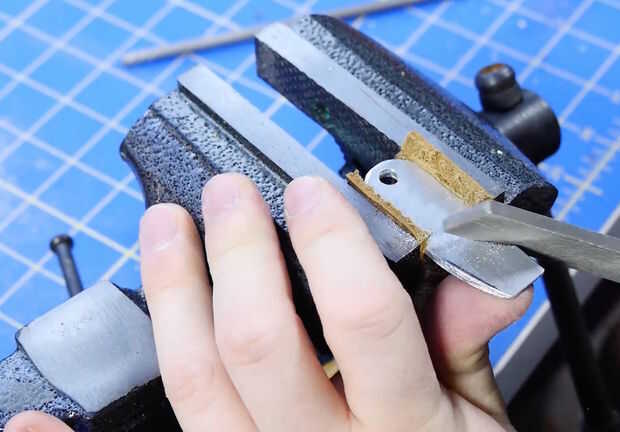 Una vez todos los cortes, es hora de afinar la forma con los archivos. Fijar el abrelatas de botella con un tornillo de banco y me fui a la ciudad, disminuyendo al final del abrelatas de botella, así que puedo usar como un abridor de caja en un apuro, y finalmente terminé redondeo al final del agujero dominante. Utilizar la pequeña lima redonda para abrir el agujero para el abrelatas de botella y el archivo plano a ambos lados de la abertura de la forma.