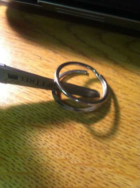 Inserte su tijera entre las bandas de metal del llavero. Entonces orientar la herramienta para que se pueda abrir el llavero para que uno de los extremos, el gancho, sobresale en un ángulo de 90 grados alrededor.