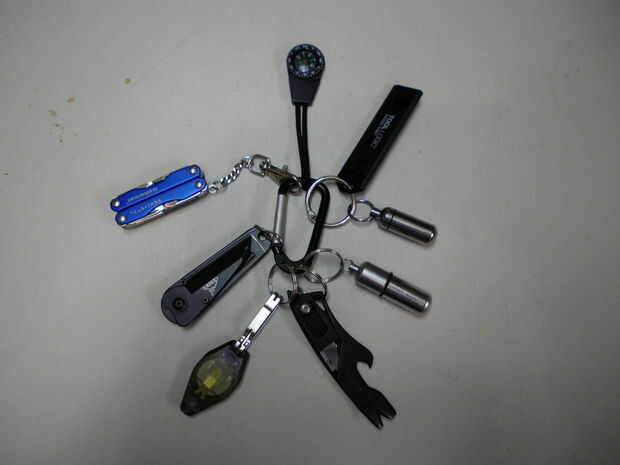 Se trata de supervivencia herramienta llavero que puse juntos. Tiene 9 herramientas básicas que se realizan muchas funciones importantes en una variedad de situaciones. Hay un compás de miniatura, 2 formas para iniciar un fuego, almacenaje seco blando, un silbato, una mini palanca, un abrelatas de botella, cuchilla quirúrgica, una linterna, una luz de señal, una mini herramienta multiusos y un cuchillo plegable todos almacenados en un pequeño mosquetón. Todas estas herramientas que pesan juntos menos de 8 onzas. Llevar este anillo en mi paquete cuando estoy en el bosque.