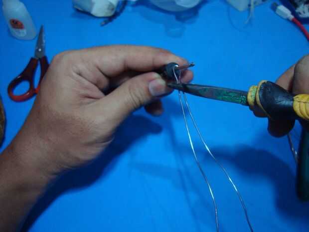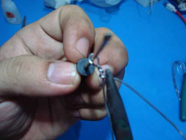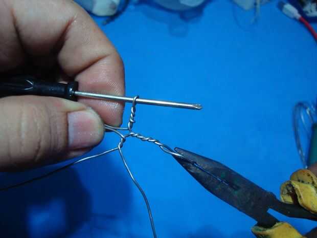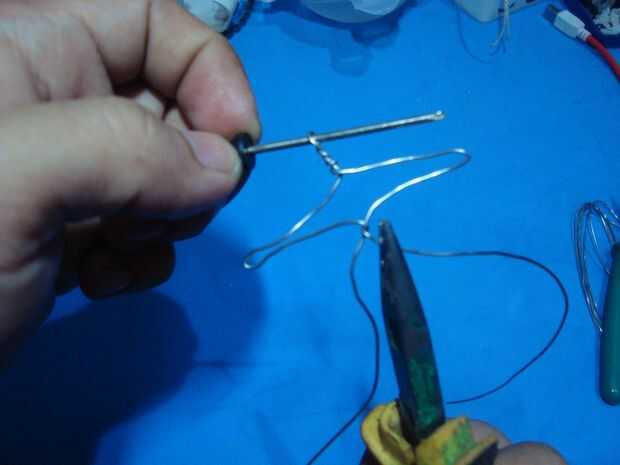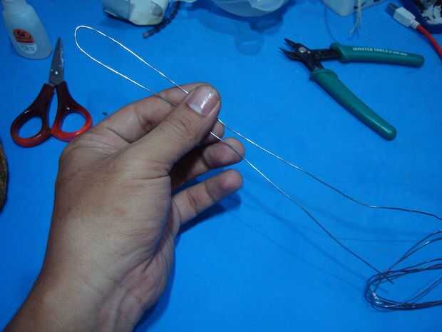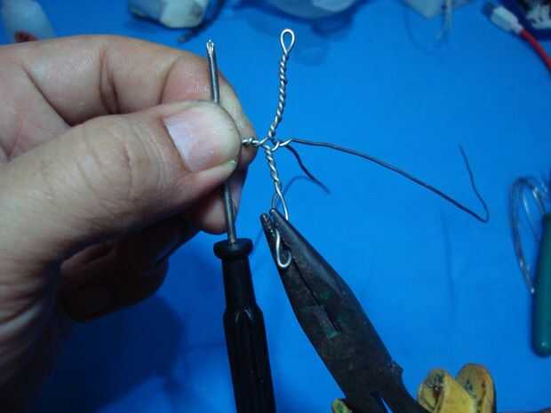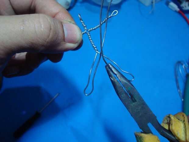 cortar aproximadamente 30 cm de alambre y luego doblarlo por la mitad. en los pliegues de la varilla de perforación con un destornillador pequeño para formar un círculo. entonces giró una pequeña varilla de alambre (foto n º 2-4).