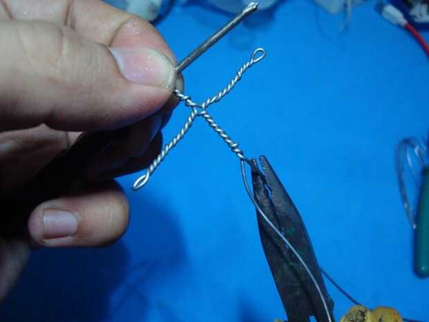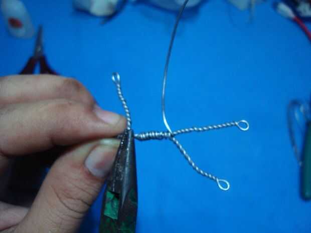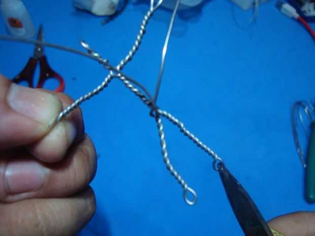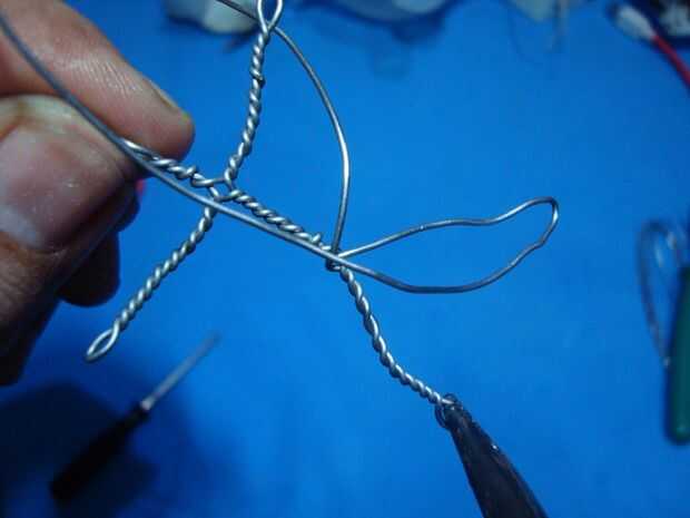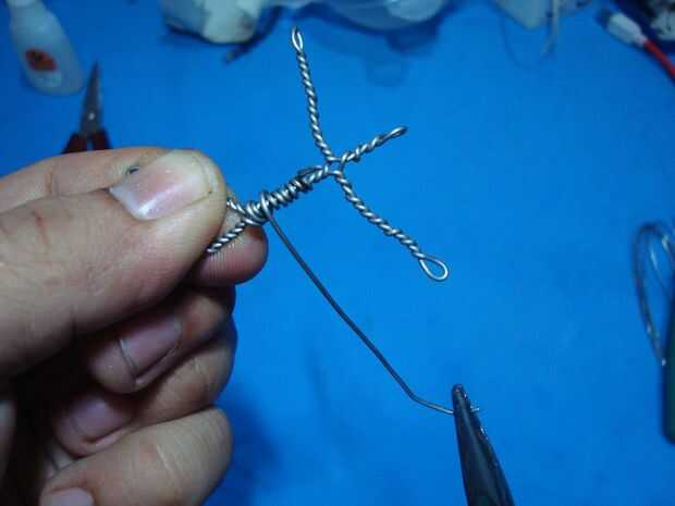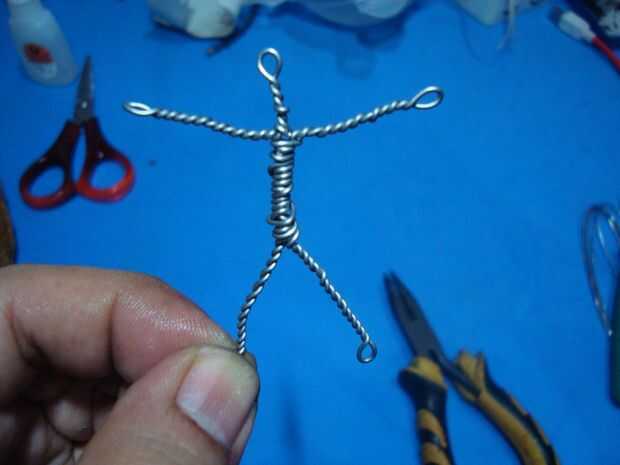 hacer un momento flector en cada tallo en dos partes así que el carril de alambre. (foto n º 5) y luego el segundo alambre de la tira en giró y construido por la circunferencia de la parte inferior de juka en tira de hasta forma una cruz. (pic.8) y en la parte inferior para la línea de 2 hilos formar las piernas, lo mismo que el abrigo anterior a unite.and el resto del cable que ha no podido desplazarse por giraban alrededor de la mitad para formar el cuerpo.
